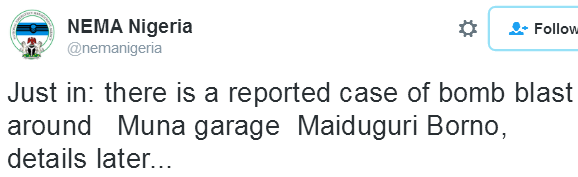 18 people are feared dead after a bomb ripped through a convoy at a car park in Muna garage located in the outskirt of Maiduguri, Borno state this morning. Most of the casualties are said to be passengers and drivers who were at the garage. Corpse of the deceased have been deposited at the morgue of a specialist hospital in Maiduguri.